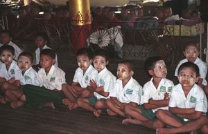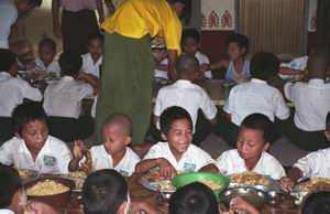 首都ヤンゴン郊外にあるお寺が孤児院をもっています。 内戦や貧困等諸事情によって孤児となった約330人(2004/4現在)、4歳から18歳の子どもがいます。 その内約100人は、自らも僧侶となり、自分の食事と孤児院の仲間達の生活費を托鉢で得て、何とか孤児院の生活費を工面しています。 顔のペイントは歓迎の挨拶です。 訪問時にはご馳走が並んでいました。はて?。 実は町のとある男性の“施し”だったのです。その方、今日が愛娘の誕生日なのでだそうです。「誕生日だから皆さんに喜んでもらいたい」とニコニコしています。ミャンマーでは誕生日に人にご恩返しをするということが、ごく普通のことなんだとか。その精神にビックリ。 だって日本では、「誕生日だから、わ・た・しにプレゼント頂戴〜!」が当たり前。他人に施すなんて聞いたこともないし、考えたことも無かったなぁ。おー、恥ずかしい。 ここにも仏の教えが生きているのです。経済的には貧しい国なのに、人々の心はとても豊かであたたかでした。まるで昔の日本みたいに。 子ども達はサッカーが大好き。 しかしこの国は軍事政権。民主化を求めるアウンサン・スーチーさんは軟禁され、国民の経済や言論・思想・移動の自由は奪われています。何しろ親戚の家に泊まることすら出来ないんです。ガイドの20代男性は、人目を気にしながら(反政治発言は、誰かに聞かれると捕まるんです)、政権の腐敗やこの国の将来を嘆いていました。 経済的豊かさは人心を荒廃させがちです。しかし自由は脅かされたくありません。んー、難しい。「頼むから日本のようにモノは豊かでも、心の貧しい国になってくれるなよ」と思いながら帰国しました。 ミャンマー良いとこ、1度はどうぞ。 京成バス発見!中古の日本車が そのままのペイントで走っているんです。 おわり |