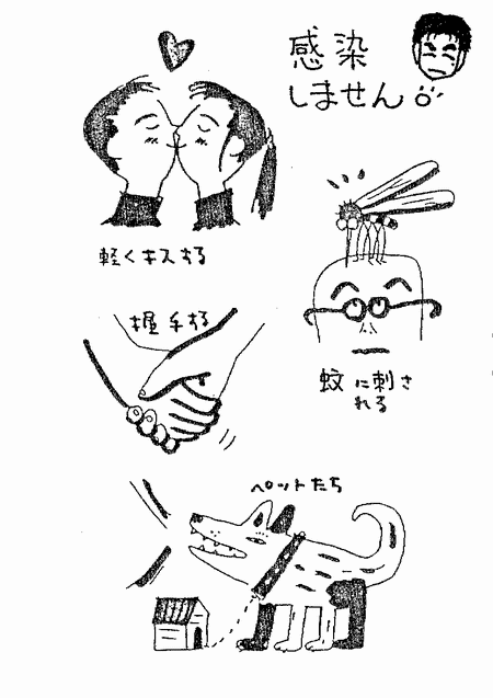 純朴な人々の素敵なこの国にも、深刻な問題があります。それは《エイズ》です。人口6000万人に対して、エイズ患者累計約10万人(内27000人死亡)、感染者推定約90万人(1998年10月現在)。何と2000年には400万人!になると想定されています。恐るべき数。 何故タイでは、こんなにエイズが広まってしまったのでしょうか?。 1984年、アメリカ留学から帰って来た同性愛者が、タイでのエイズ患者第一号でした。やがて麻薬中毒者の間で広まり、売春婦を通じて増加、夫が妻へうつし、子どもへ。発症までの潜伏期間が2年から10年ということも、対策が遅れ広まってしまった一因でもあります。日本の10年後は大丈夫なのかな?。 エイズとは「後天性免疫不全症候群」のことで、HIVウィルスが悪さして身体の免疫機能が低下するため、様々な病気(皮膚病や肺炎・風邪・カビ等)に抵抗できず、死に至ります。 健康な人ではまずあり得ない、皮膚にカビが生えてただれてしまうことも多く、その外見の悪さから「怖ろしい病気」との誤解を生み、差別を引き起こしているようです。 エイズは感染力が非常に弱い病気なのです。こんな場合はうつりません。 ![]() 感染者と…………@握手して …………A一緒に食事して 感染者の…………B唾液や汗から 感染者を刺した…C蚊に刺されて うつることはありません。 私は恥ずかしながら知りませんでした(-_-;)。 HIVウィルスは体液中に存在し、次の三種類の媒体を通してうつると言われています。 @精液・膣液 A血液 B母乳 これらを直接体内に取り込まなければ、うつることはありません。気を付けていれば、感染者と一緒に暮らしても、何〜んも心配いらないのです。な〜んだ、誤解してた。「知ろうとしない」ことが、偏見や差別を生み出すのですね。 エイズについてのレクチャーを受けた我々一行は、国内線でタイ東北部ウボンラチャタニ県ウボン市へ。ホテルで一泊した後、バスにて隣り県のアムナチャラン県立病院へ向かいました。 ここではエイズに感染した母親同士が月に一回ミーティングを行っています。その現場を見学させてもらいました。 次回はその時の様子を報告いたします。 (つづく) |