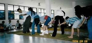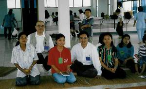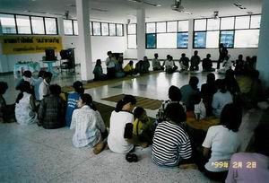 我々一行が訪問したアムナチャラン県立病院では、主に妊娠によってエイズ感染を知らされた母親達が中心となって、月1回「ワークショップ」と呼ばれるミーティングを行っています。ちなみにこのミーティングは、日本のNGO【シェア=国際保険協力市民の会】が主催しています。 増築間もない綺麗な病院の大きな一室に、50名程の人が集まっていました。男女共10代後半から30代。女性が多く、その子供もいます。この子も感染しているのでしょうか。 私は初めて対面するエイズウィルス感染者に戸惑いを隠せませんでした。しかし、感染者が必ずしも発症しているという訳ではないのです。外見にそれと分かる人はほとんどいませんでした。また「普通の生活ではうつらない」としっかり学んだことでもあり、意を決してその輪の中に入ると、私達を温かく迎え入れて下さいました。 最初は簡単なゲームによりリラックスの後、お医者さんによるヨガを取り入れた体操をします。続いてシェアスタッフによる座談会。エイズに対する正しい知識、感染者の村での生活状況等の話し合いです。 未だエイズは「感染力の強い怖ろしい病気」という “偏見”があります。よって多くの感染者は、それぞれの村で名乗り出ることが出来ずに、やがて来る死の恐怖に怯えながらひっそりと暮らしています。その悩みや母子感染の悩み、また勇気を持って村で告白した方のその後の様子等が語られていました。 お昼を迎えたので、皆さんと膝を交えて食事をとる事となりました。メニューは辛いスープとご飯・鶏肉とサラダにフルーツです。当然“手”で頂きます。 スープをご飯に混ぜてパクッ!「辛い!」。私もタイの方も、お互いに英語が喋れないので言葉は通じないのですが、私の辛そうな仕草に「ペッ」と言って笑っていました。「そうか、ペッは辛いなんだぁ」。異文化交流はこうして始まるのでしょうねー。ご飯は「カー」、美味しいは「アロイ」。コミュニケーション成立です。その後は、笑いが絶えない食事会となりました。「ペッ」の料理は暑い風土にぴったり。とっても「アロイ」でした。 エイズウィルスは、患者と一緒に食事をしてもうつりません。 《知らない》ということは、この素晴らしい笑顔の方々の「生きる権利」をも踏みにじり、ひいては自分の生き方まで「狭い世界に閉じ籠もらせてしまうこと」なのだと痛感しました。 しかし彼女達、大変な現実を背負っているのですよねー。 それでもしっかりと生きようとする姿に、「凄い!!」と只々頭が下がりました。 (つづく) |