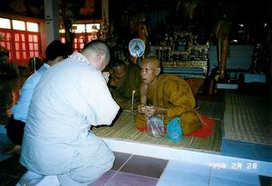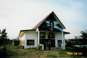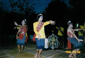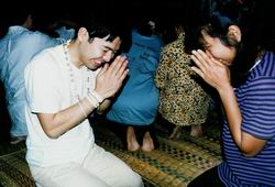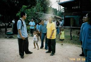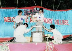 我々一行は、エイズ感染者の「ワークショップ」に参加していた姉妹の招待を受け、アムナチャラン県立病院を後に、彼女の村へ向かいました。 車で一時間ほどのナーパーセーン村は、67世帯が住んでいます。農業中心で、女性は織物を営み、若者はバンコク等の都市へ出稼ぎに出るという、どちらかといえば貧しい村です。 姉のトゥイさんは、3年前に先の病院で出産し、エイズ感染を知りました。そして妹のプックさんは、ご主人をエイズで亡くされました。 お二人は感染していることを隠さず、むしろ積極的に公表しています。そして、それに対する差別と向き合っています。 ![]() エイズは、普通の暮らしでうつることはない病気です。ですから姉妹は、生まれ育った村で、馴染みのみんなと共に、生涯を閉じていきたいと望まれているのです。 祝宴まではまだ時間があるので、村を案内してもらいました。 標準的な家は2階建てで、1階ははた織り機や農耕道具などがあり、涼しい2階が住処です。そして、辺りには鶏が放し飼い状態。 お寺がありました。日本とは違い、華やかなお寺です。 気さくな住職さんが、上がって行けと手招きします。本堂でタイ式の儀式を受けました。 住職が経文を称えながら、鉢に注いだ聖水をハケの様なもので人々に振り注ぎます。しかし、聖水をじゃんじゃんかけるものですから、服がベチャベチャになってしまいました《かけすぎだよ(T_T)》。まっ、暑いてすぐ乾くので、いいんですけど。 いよいよ日も暮れてきたので、来客歓迎祝宴の始まりです。 村の広場にはゴザが敷かれ、舞台まで用意され、村人みんな総出!です。子供達の可愛い踊りあり、歌あり、大歓迎を受けました。 そしてご馳走の数々。ここでは当然手で食べます。しかし手を洗っていないんですよねー。ですから、餅米を丸めると、なんとなく色が付き…。まあ、気にしていたら、せっかく用意してくださった、その気持ちに水を差すことになりますし。見ない見ない。それを鶏のスープに浸けてパクッ。とっても「アロイ!(おいしい)」。手で食べるのも良いものですね。 我々は手品を披露しました。非常に簡単な手品なのですが、皆さん酔っていることもあり、大盛り上がり。お互いに言葉は通じないのですが、身振り手振りで意気投合し、おっちゃんと肩を組んで踊り明かしました。 どうやら私、タイの方にもてるようで…。“男”女とも。若い娘は嬉しいのですが、私に「日本の俳優か?」とお世辞を言ってすり寄ってきた美少年、アレだという噂が。ハァ…(*^_^*)。 とっても陽気で気さくな愛すべき人々。しかし降りかかるエイズという悪魔。村を後に、ちょっとブルーになってしまいました。 明かりのほとんど無い、真っ暗なタイの田舎の夜。車窓を眺めながら先の村人達に思いを巡らしていると、更に一撃。なんと地元の運転手が「道に迷った!」と。「エー!!かっ、帰れるの?!」。 (つづく) |
