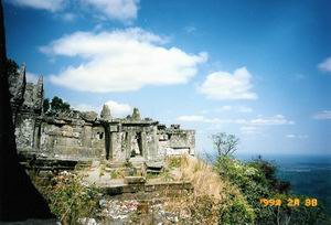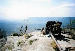 我々一行は、カンボジアのクメール遺跡で息抜き。といってもタイ国境のすぐ傍なのでバスで行きます。 クメール王朝の寺院遺跡『カオプラビハーン』は、長かったカンボジア内線の主役、共産勢力『クメールルージュ』の拠点のすぐ傍。私が訪れた時の僅か1年前、1998年になってやっと公開された場所です。 よって 未だに、地雷に注意しろとの警告「ドクロマーク」の看板が!!。ヒェ〜。「もしかして、このメイン通路のどこかにまだ誰も歩いていない場所があって、そこに最後の1個が埋まってたりして?」。まっ、そんな訳ないか。 ドクロ! “仏教遺跡”であると聞き楽しみにしていたのですが、実際に現地で観察して見ると神々を描いたレリーフが無数に見当たりました。ですから、ヒンズー教の寺院遺跡ではないかと思われます。 遺跡は戦争の影響でかなり荒廃していました。それもその筈、内線当時神々のレリーフは、有力な資金源として海外へ売られていったそうです。きっと金満大国の○本という国に沢山渡ったのでしょう。知らず知らずのうちに、戦争に協力しているということもあるのです。 クメールルージュ達は、知識人を悉く抹殺しました。そして子供達を革命の戦士とし、人殺しに仕立て上げたという爪痕は、この穏やかな仏教国のカンボジアを、今も深く傷付けています。戦争は「ドンパチが止めばそれでおしまい」とはいかないのです。いつまでもうずく傷を抱えていかねばならない。決して消えることのない傷を。 内線の様子は、名作映画『キリングフィールド』に克明に描かれています。人が殺し合う様子は、涙無くしては見られません。 そしてその内線の裏には、かの“東西冷戦”が深く関与していたのでした。大国のエゴの犠牲でもあり、その戦いで使われた武器は、日本を含めた大国製なのです。 カンボジアのジャングルを500b下に見下ろすこの高台には、未だ大砲や撃ち落とされたヘリコプターが放置してありました。 戦争は何も作り出しません。そして大義や名分も“掛け替えのないいのち”の前には意味がないものです。その暴力によって傷つくのは、戦争を始めた権力者ではなく、庶民です。親は子供を奪われ、子供は両親を殺され、女性はレイプされ、人々は家を失う。限りない略奪と、消えない憎しみ。 まだ生々しい無言の遺跡は、その事実を静かに物語っていました。 後日談。新聞に『カオプラビハーンの通路で、最後まで残っていた地雷が爆発した』と。 冗談で言っていたことが現実に(@_@)。ゾッ。危なかったー。 (つづく) |