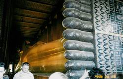 | プラバトナンプー寺院でエイズ患者の現状を目の当たりにした我々一行は、ショックを受けたまま一路バンコクへ向かいました。 この大都市バンコクの繁華街では、今も売春が行われています。 タイ東北部など地方からの出稼ぎ者が、ここでHIVウィルスをもらって帰ることが多いのです。そして夫から妻へ。母から子へ。すべての始まりが欲望渦巻くこの街なのです。 タイ国政府のキャンペーンが実り、感染者数は横這いとなりました。が、人口6000万人に対して、感染者推定約90万人(1998年10月現在)。それにしても凄い、凄すぎる…。 ☆☆☆ 改めて確認したいと思います。 エイズは、HIVウィルスの感染によって身体の免疫機能が低下し、様々な病気(皮膚病や肺炎・風邪・カビ等)を引き起こし、死に至るものです。しかし感染力は非常に弱い病気です。そして2003年現在では、薬を飲み続けることによって発症を抑えることが可能です。正しい知識を持てば、怖い病気ではないのです。怖いのは患者ではなく、勝手に怖いモノと決めつけ、無関心という凶器を振り回す我々の方です。 正しい知識が有れば、エイズ患者と一緒に暮らしていても、感染することはありません。しかし、我々の“無関心”からもたらされる“無知”によって、差別が生まれます。人生最後の拠りどころななるべき、家族にさえも捨てられてしまった人々…。我が身可愛さというエゴを振り回し、人はどこまでも残酷になり、どこまでも孤独になっていくのでありましょう。人ごとではない我が姿を、数々の出会いによって気付かされました。 ☆☆☆ 先日の厚生省の報告によると、日本でも20代・30代の感染者が増えているそうです。必要なのは避ける為の正しい知識。そして、もし感染が発覚した人にも、差別や偏見の無いように接していくこと。日常生活でうつることはないのですから。 !超巨大涅槃仏! 人は必ず命を終えて行かねばなりません。そのきっかけは病気・事故・老衰・天災と様々ですが。しかし差別と偏見により社会から抹殺されて死んでいくことの辛さ、悔しさと言ったら無いでしょう…。やがて死んで行かねばならない“私”と“あなた”だからこそ、理解と和解が大切であり、それが『共に生きる』ということなのですね。 ☆☆☆ タイでは凄まじい現実に触れました。あの感染者の方々は、今どうされているのだろうか…。後日談。ナーパーセーン村の感染者トゥイさんとプックさん、2003年2月に訪問して友人達がお会いしたとのこと。ヨカッタァー(^O^)! 共に重荷に耐えて踏ん張ろう!オォー! (終) |